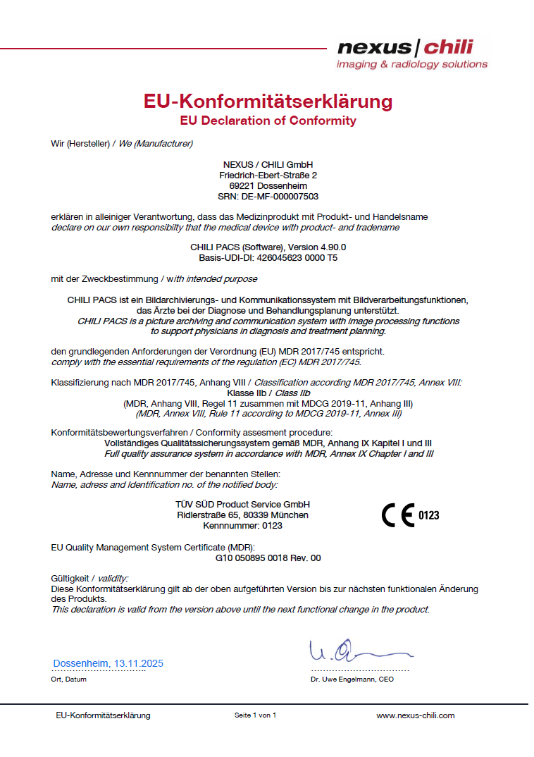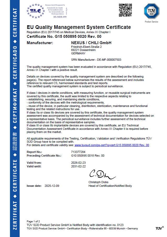 Die NEXUS / CHILI GmbH hat ein zertifiziertes Qualitätsmanagement System auf der Basis der Norm DIN EN ISO 13485:2016 eingeführt und wendet dieses an. Unser Medizinprodukte sind konform zu den geltenden Medizinproduktegesetzen und tragen das CE-Zeichen auf Basis der EU-Verordnung 2017/745 (MDR).
